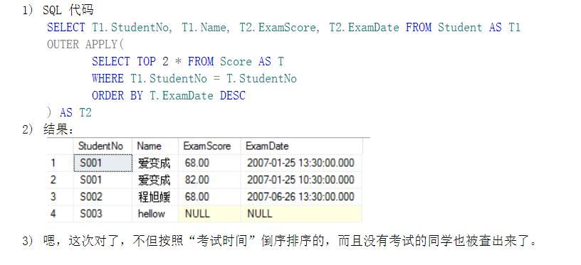 2) OUTER APPLY 的意思是“外部应用”,与 CROSS APPLY 的原理一致,只是在匹配失败时,左表与右表也将合并为一条记录输出,不过右表的输出字段为 null。(与 LEFT OUTER JOIN 类似)