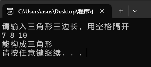 #include<stdio.h> #include<stdlib.h> int main() { float a=0; float b=0; float c=0; printf("请输入三角形三边长,用空格隔开\n"); scanf("%f %f %f",&a,&b,&c); if(a<=b+c||b<=a+c||c<=a+b) printf("不能构成三角形\n"); else printf("能构成三角形\n"); system("pause"); return 0; }