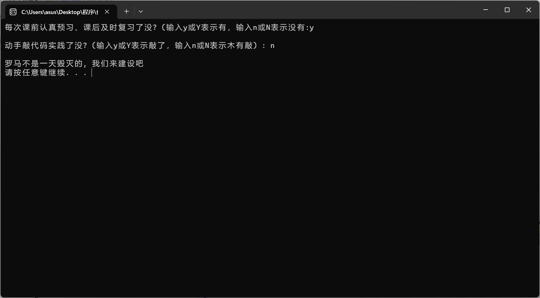 printf("\n罗马不是一天毁灭的, 我们来建设吧\n");