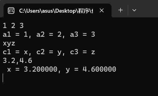#include<stdio.h> #include<stdlib.h> int main() { double x, y; char c1, c2, c3; int a1, a2, a3; scanf("%d%d%d",&a1,&a2,&a3);//line9 printf("a1 = %d, a2 = %d, a3 = %d\n", a1,a2,a3); scanf(" %c%c%c", &c1, &c2, &c3); printf("c1 = %c, c2 = %c, c3 = %c\n", c1, c2, c3); scanf("%lf,%lf", &x, &y);//line15 printf(" x = %f, y = %lf\n",x, y); return 0; }