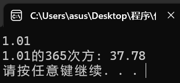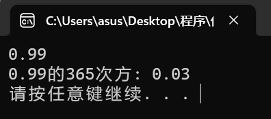 #include<stdio.h> #include<stdlib.h> #include<math.h> int main() { double x, ans; scanf("%lf", &x); ans = pow(x, 365); printf("%.2f的365次方: %.2f\n", x, ans); system("pause"); return 0; }