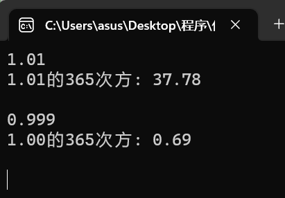 #include <stdio.h> #include <math.h> int main() { double x, ans; while(scanf("%lf", &x) != EOF) { ans = pow(x, 365); printf("%.2f的365次方: %.2f\n", x, ans); printf("\n"); } return 0; }