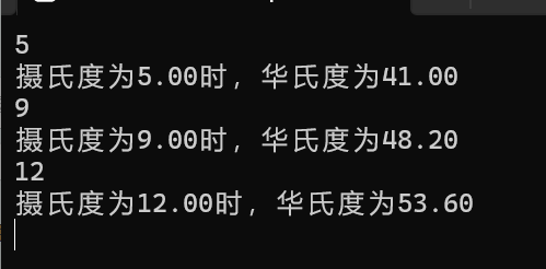#include<stdio.h> int main() { double temf=1; double temc=1; while(scanf("%lf",&temc)!=EOF) {temf= 9*temc/5+32; printf("摄氏度为%.2lf时,华氏度为%.2lf\n",temc,temf);} return 0; }