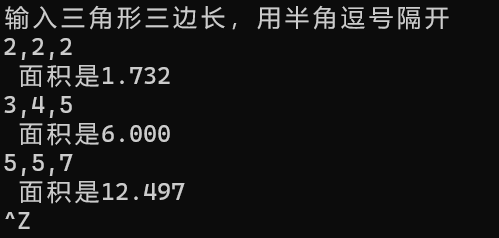 #include<stdio.h> #include<stdlib.h> #include<math.h> int main() { double a=0; double b=0; double c=0; double s=0; double square=0;; printf("输入三角形三边长,用半角逗号隔开\n"); while(1) {scanf("%lf,%lf,%lf",&a,&b,&c); s=(a+b+c)/2; square=sqrt(s*(s-a)*(s-b)*(s-c)); printf(" 面积是%.3lf\n",square);} system("pause"); return 0;