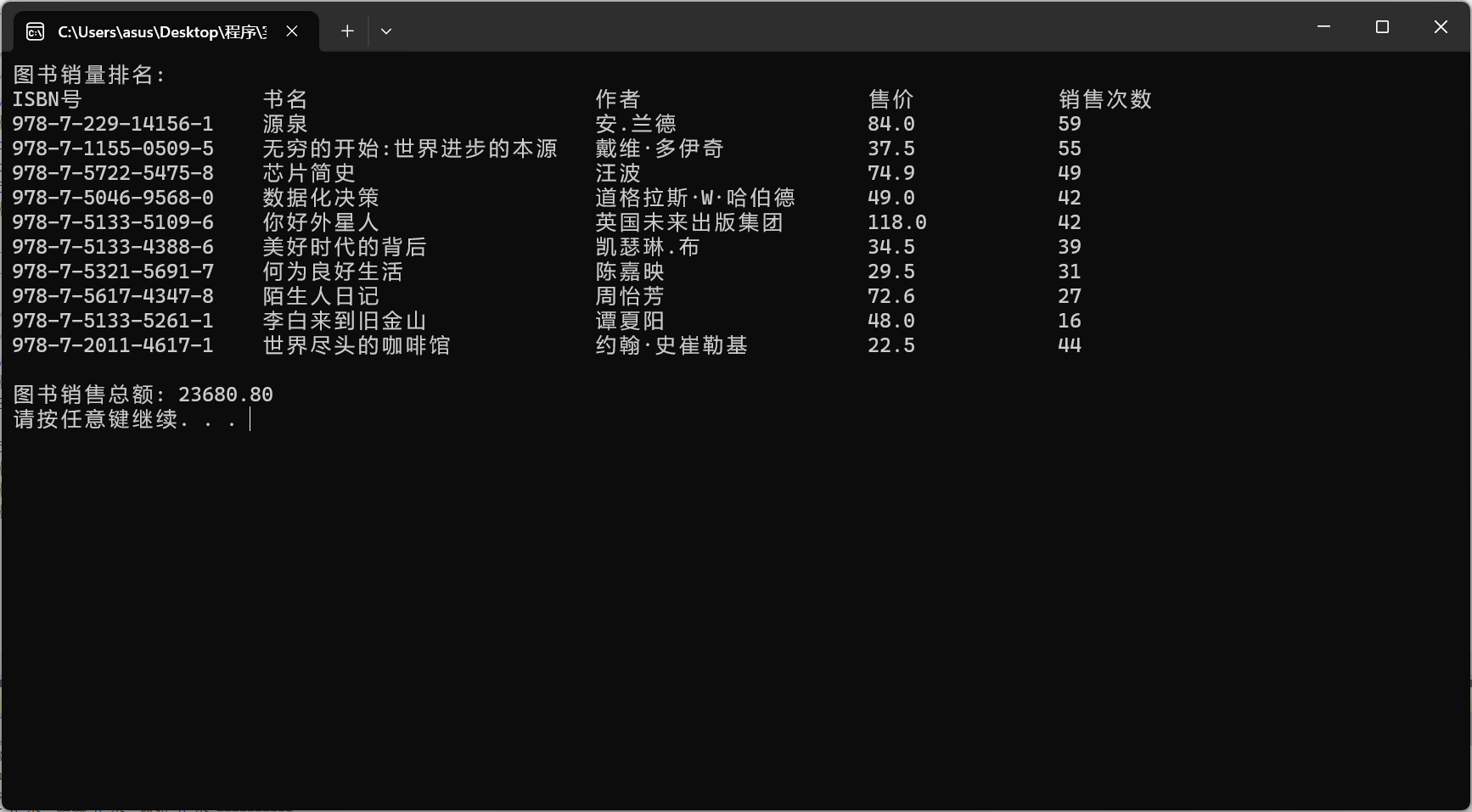 #include <stdio.h> #include<stdlib.h> #include<string.h> #define N 10 #define _CRT_SECURE_NO_WARNINGS 1 typedef struct { char isbn[20]; // isbn号 char name[80]; // 书名 char author[80]; // 作者 double sales_price; // 售价 int sales_count; // 销售册数 } Book; void output(Book x[], int n); void sort(Book x[], int n); double sales_amount(Book x[], int n); int main() { Book x[N] = {{"978-7-229-14156-1", "源泉", "安.兰德", 84, 59}, {"978-7-5133-5261-1", "李白来到旧金山", "谭夏阳", 48, 16}, {"978-7-5617-4347-8", "陌生人日记", "周怡芳", 72.6, 27}, {"978-7-5722-5475-8", "芯片简史", "汪波", 74.9, 49}, {"978-7-5046-9568-0", "数据化决策", "道格拉斯·W·哈伯德", 49, 42}, {"978-7-5133-4388-6", "美好时代的背后", "凯瑟琳.布", 34.5, 39}, {"978-7-1155-0509-5", "无穷的开始:世界进步的本源", "戴维·多伊奇", 37.5, 55}, {"978-7-5321-5691-7", "何为良好生活", "陈嘉映", 29.5 , 31}, {"978-7-5133-5109-6", "你好外星人", "英国未来出版集团", 118, 42}, {"978-7-2011-4617-1", "世界尽头的咖啡馆", "约翰·史崔勒基", 22.5, 44}}; printf("图书销量排名: \n"); sort(x, N); output(x, N); printf("\n图书销售总额: %.2f\n", sales_amount(x, N)); system("pause"); return 0; } // 待补足:函数output()实现 // ××× void output(Book x[], int n) {int i; char o[][13]={"ISBN号","书名","作者","售价","销售次数"}; printf("%-20s %-28s%-20s\t%-10s\t%-5s\n",o[0],o[1],o[2],o[3],o[4]); for(i=0;i<n;i++) { printf("%-20s %-28s%-20s\t%-10.1lf\t%-5d\n",x[i].isbn,x[i].name,x[i].author,x[i].sales_price,x[i].sales_count); } } // 待补足:函数sort()实现 // ××× void sort(Book x[], int n) {int u,i; Book t; for(i=n-1;i>1;i--) {for(u=1;u<i;u++) {if(x[u-1].sales_count<x[u].sales_count) { strcpy(t.author,x[u-1].author); strcpy(t.isbn,x[u-1].isbn); strcpy(t.name,x[u-1].name); t.sales_count=x[u-1].sales_count; t.sales_price=x[u-1].sales_price; strcpy(x[u-1].author,x[u].author); strcpy(x[u-1].isbn,x[u].isbn); strcpy(x[u-1].name,x[u].name); x[u-1].sales_count=x[u].sales_count; x[u-1].sales_price=x[u].sales_price; strcpy(x[u].author,t.author); strcpy(x[u].isbn,t.isbn); strcpy(x[u].name,t.name); x[u].sales_count=t.sales_count; x[u].sales_price=t.sales_price; } } } } // 待补足:函数sales_count()实现 // ××× double sales_amount(Book x[], int n) { int i; double r=0; for(i=1;i<=n;i++) { r+=(x[i-1].sales_count*x[i-1].sales_price); } return r; }
