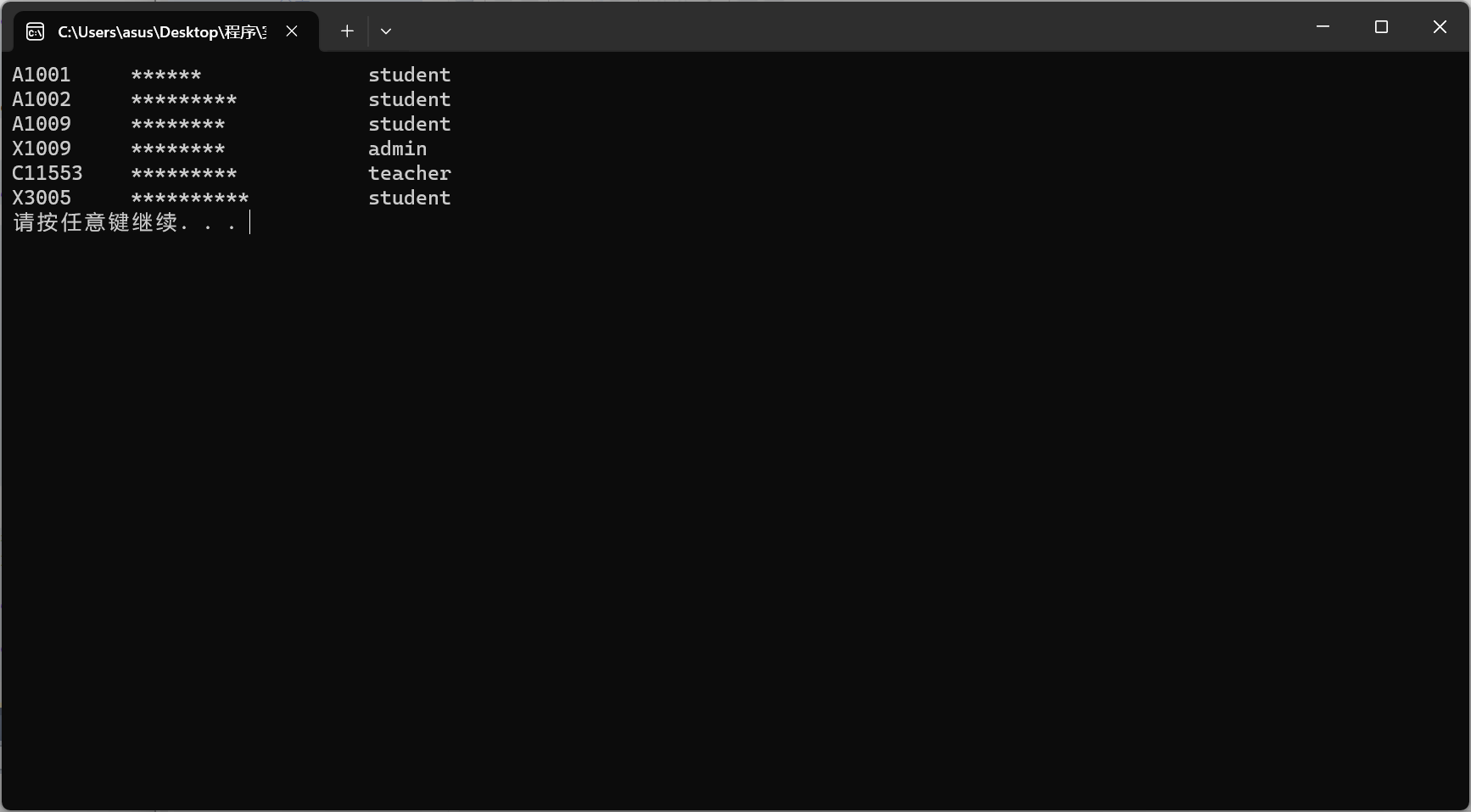 #include <stdio.h> #include <string.h> #include<stdlib.h> enum Role {admin, student, teacher}; typedef struct { char username[20]; // 用户名 char password[20]; // 密码 enum Role type; // 账户类型 } Account; // 函数声明 void output(Account x[], int n); // 输出账户数组x中n个账户信息,其中,密码用*替代显示 int main() { Account x[] = {{"A1001", "123456", student}, {"A1002", "123abcdef", student}, {"A1009", "xyz12121", student}, {"X1009", "9213071x", admin}, {"C11553", "129dfg32k", teacher}, {"X3005", "921kfmg917", student}}; int n; n = sizeof(x)/sizeof(Account); output(x, n); system("pause"); return 0; } // 待补足的函数output()实现 // 功能:遍历输出账户数组x中n个账户信息 // 显示时,密码字段以与原密码相同字段长度的*替代显示 void output(Account x[], int n) { int i,k; char pass[20],typ[3][10]={"admin", "student", "teacher"}; for(i=1;i<=n;i++) { for(k=0;x[i-1].password[k]!=0;k++) { pass[k]='*'; } pass[k]=0; printf("%-10s%-20s%s\n",x[i-1].username,pass,typ[x[i-1].type]); } }