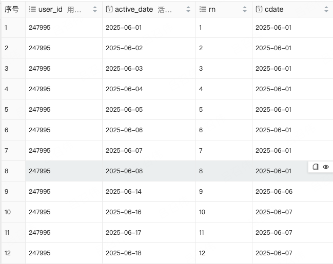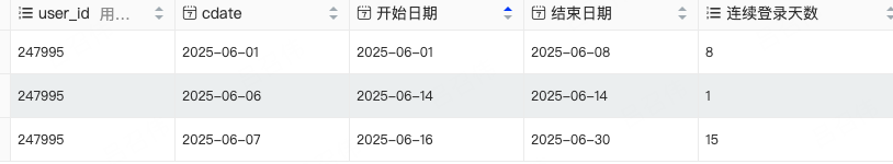 select user_id, active_date, rn, date_sub(active_date, rn -1) as cdate from ( SELECT active_date, user_id, row_number() over ( partition by user_id order by active_date ) as rn FROM user_log_records where substr(active_date, 1, 7) = '2025-06' ) a