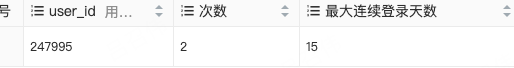 select user_id, cdate, min(active_date) as `开始日期`, max(active_date) as `结束日期`, count(1) as cont_days -- `连续登录天数` from t1 group by 1, 2