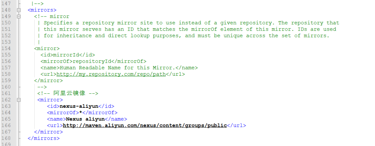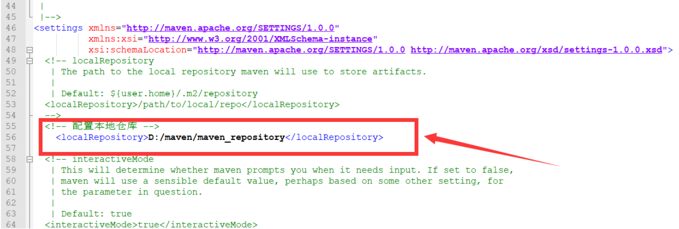 3、在settings.xml中的settings标签中配置本地仓库,在mirrors标签中配置下载镜像