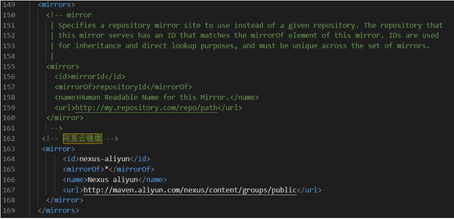 <mirror> <id>nexus-aliyun</id> <mirrorOf>*</mirrorOf> <name>Nexus aliyun</name> <url>http://maven.aliyun.com/nexus/content/groups/public</url> </mirror>