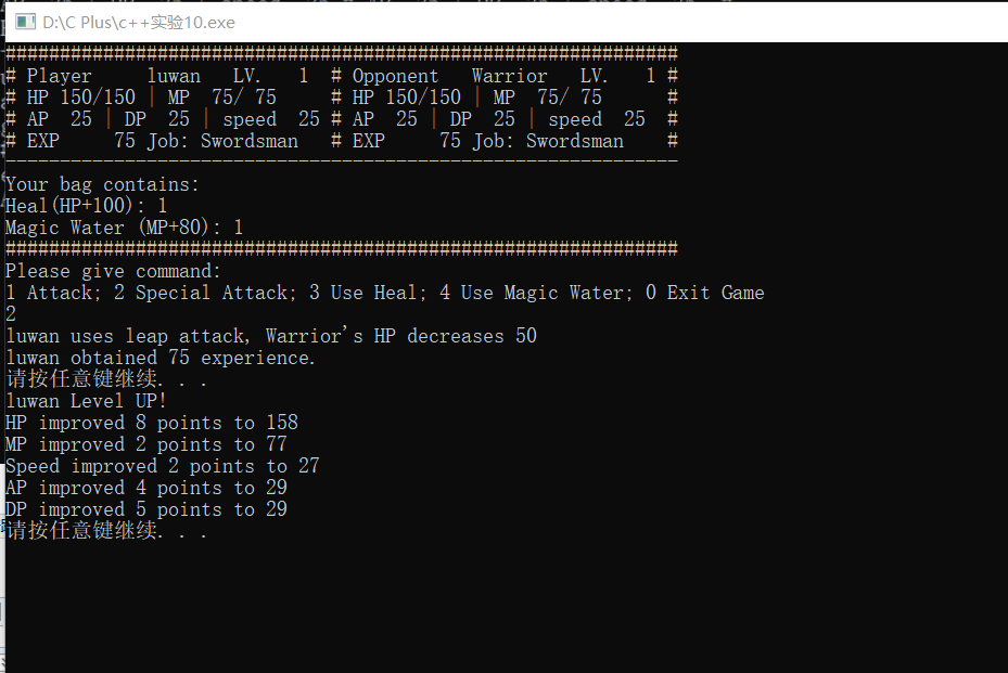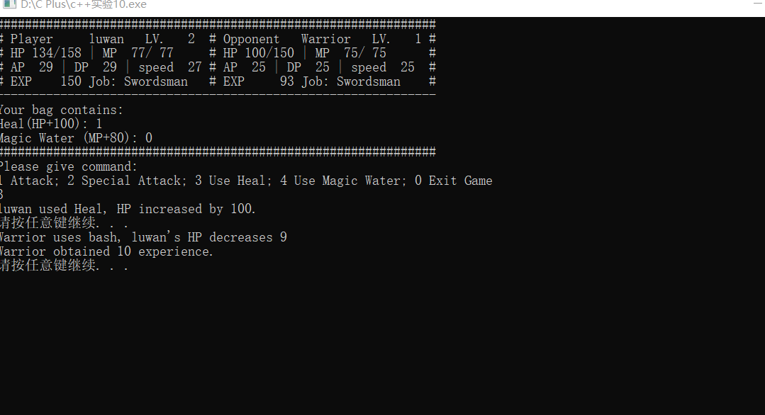 cout<<"1 Attack; 2 Special Attack; 3 Use Heal; 4 Use Magic Water; 0 Exit Game"<<endl;