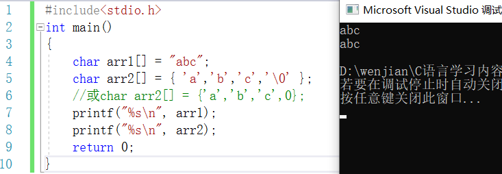 1 #include<stdio.h> 2 int main() 3 { 4 char arr1[] = "abc"; 5 char arr2[] = {'a','b','c','\0'}; 6 //或char arr2[] = {'a','b','c',0}; 7 printf("%s\n",arr1); 8 printf("%s\n",arr2); 9 return 0; 10 }