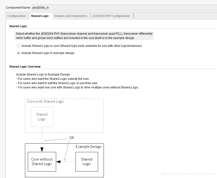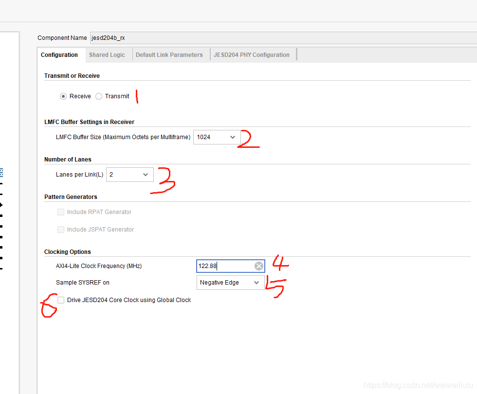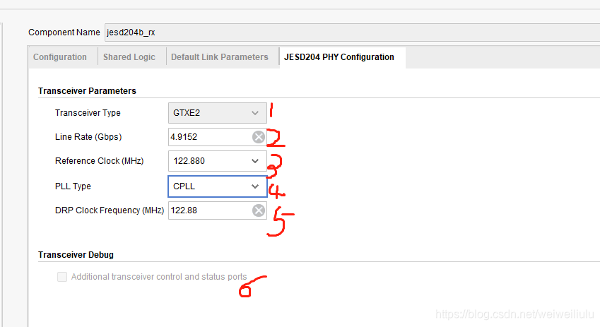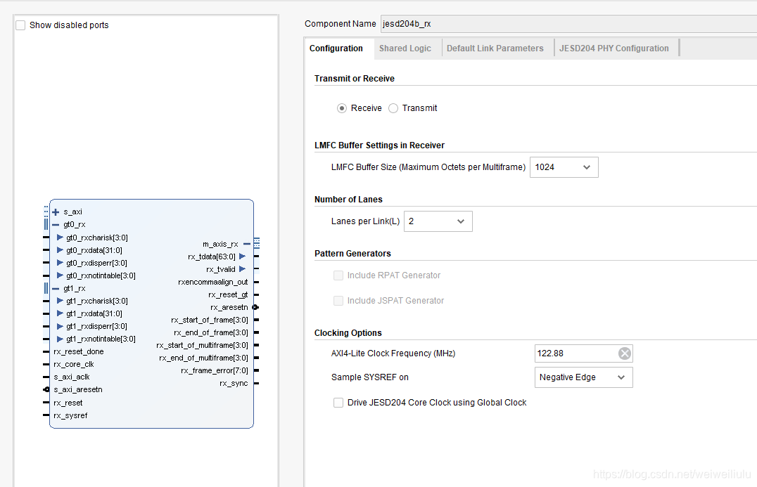 从IP 核 的界面来看, 接收 jesd204 b的输入是GTX模块的输出,而不是AD芯片直接输出的差分对,所以,在204B接口前面,还需要添加GTX模块。GTX 模块的参数配置,和204b AD 芯片配套,相同配置即可。