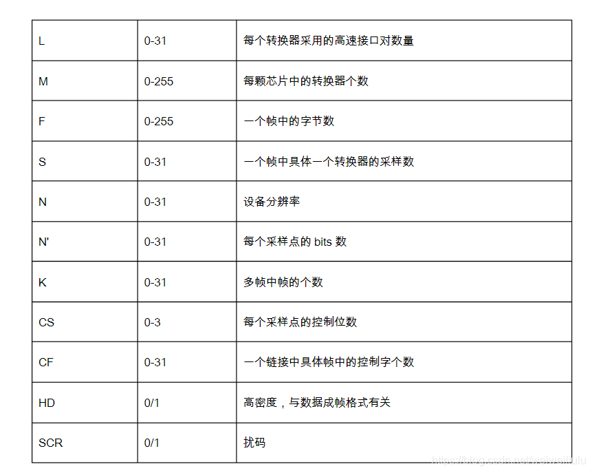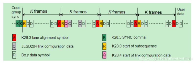 ILA:初始化多帧序列(initial lane alignment)该阶段发送连续的4个初始化多帧(多帧是由K个帧组成,字节数为K*F),本段不进行扰码和字节替换。