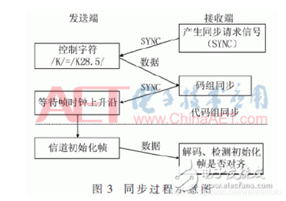 1) 串行数据传输没有接口时钟,因此RX必须将其数位及字边界与TX串行输出对齐。RX向TX发送SYNC请求信号,让其通道发送一个已知的重复比特序列K28.5。RX将移动每个通道上的比特数据,直到找到4个连续的K28.5字符为止。此时,不仅将知道比特及字边界,而且实现了CGS。