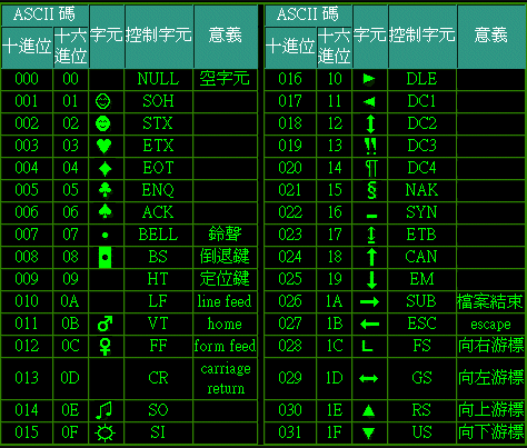 下面是ASCII码和相应数字的对照表: