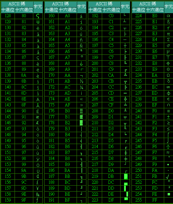 3、扩展 ASCII 打印字符:扩展的 ASCII 字符满足了对更多字符的需求。扩展的 ASCII 包含 ASCII 中已有的 128 个字符(数字 0–32 显示在下图中),又增加了 128 个字符,总共是 256 个。