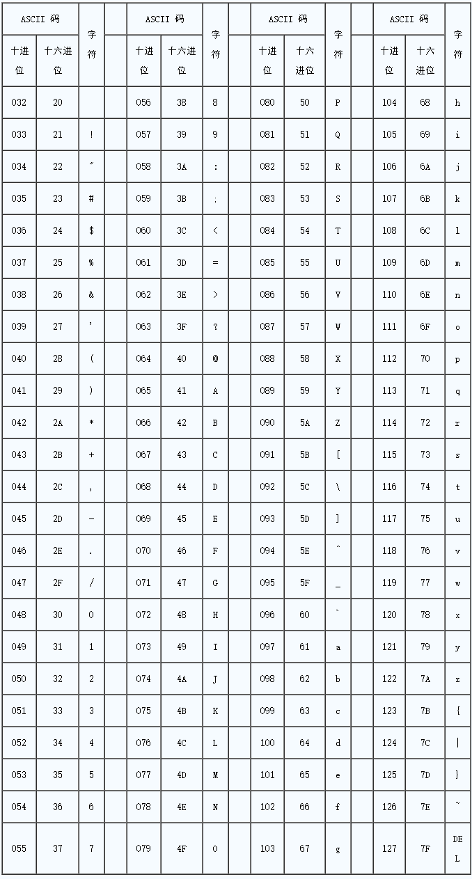 2、ASCII 打印字符:数字 32–126 分配给了能在键盘上找到的字符,当您查看或打印文档时就会出现。