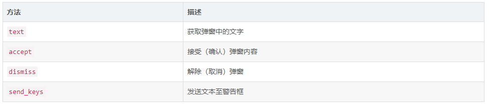 处理方式:先定位(switch_to.alert自动获取当前弹窗),再使用 text、accept、dismiss、send_keys 等方法进行操作