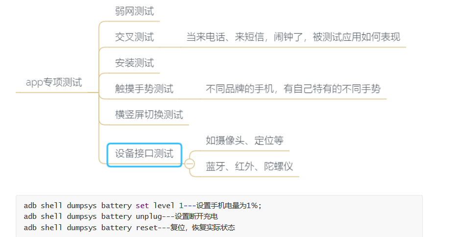 2)手机是智能移动终端,因此要考虑网络运营商、网络信号强弱、网络信号有无、被测试应用在低电量时的表现。