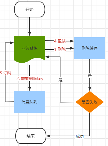第二种方案:将删除失败的key放入消息队列,处理机制是将删除失败的key不再由业务系统处理,单独启独立的线程及不影响业务系统的操作来做重试删除机制