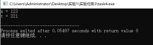 #include <stdio.h> int main() { int x, t, m; x = 321; printf("x = %d\n", x); t = 0; m = x % 10; t = t *10 + m; x = x / 10; m = x % 10; t = t *10 + m; x = x / 10; m = x % 10; t = t *10 + m; x = x / 10; printf("t = %d\n", t); return 0; }