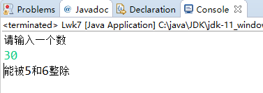1 package test; 2 3 import java.util.Scanner; 4 5 public class Lwk7 { 6 7 public static void main(String[] args) { 8 // TODO Auto-generated method stub 9 Scanner input = new Scanner(System.in); 10 System.out.println("请输入一个数"); 11 int a = input.nextInt(); 12 if (a % 5 == 0 && a % 6 == 0) { 13 System.out.println("能被5和6整除"); 14 } 15 else if (a % 5 == 0 && a % 6 != 0) { 16 System.out.println("只能被5整除"); 17 } 18 else if (a % 5 != 0 && a % 6 == 0) { 19 System.out.println("只能被6整除"); 20 } 21 else { 22 System.out.println("不能被5或6整除"); 23 } 24 25 } 26 27 }