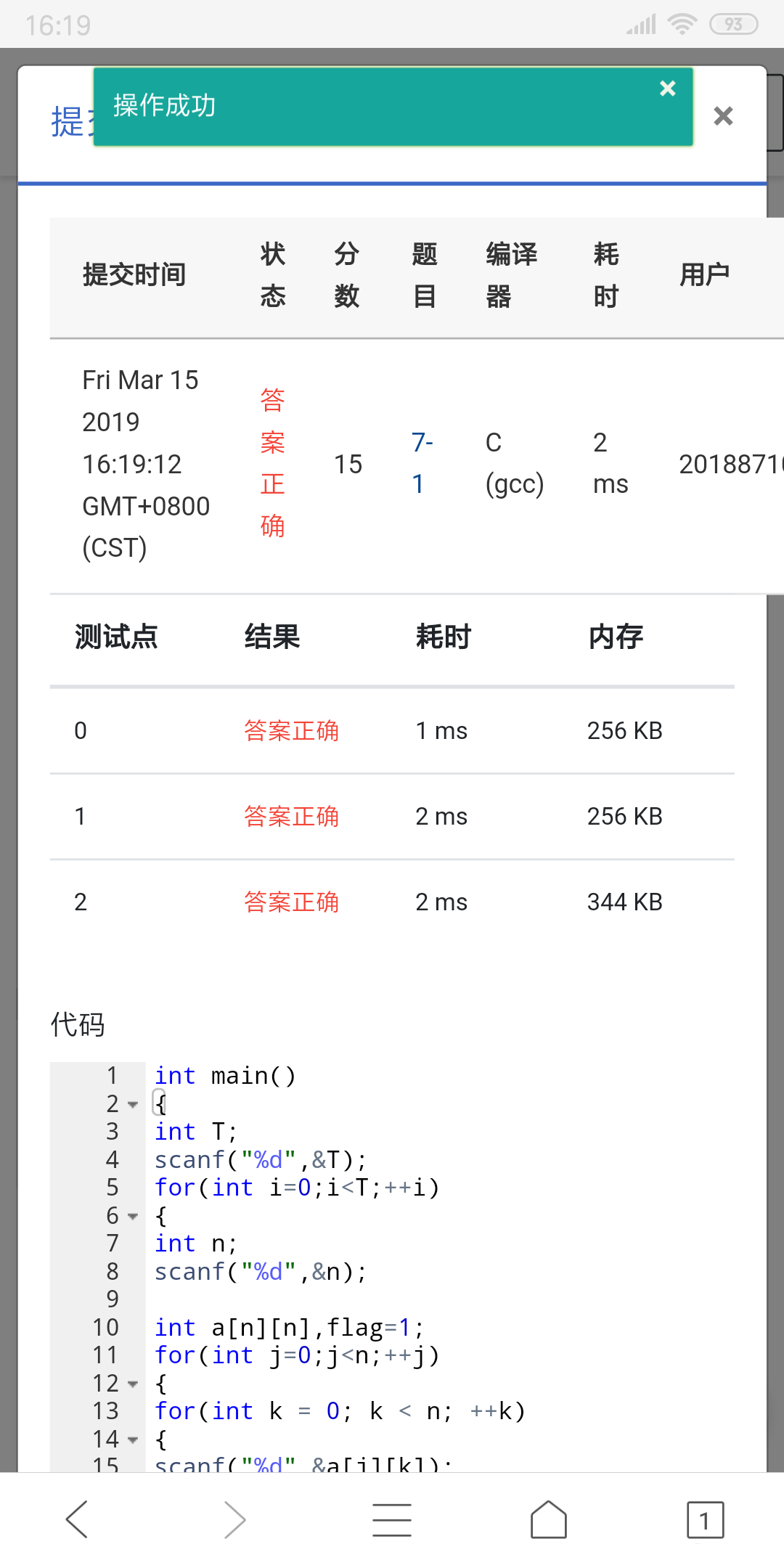 输入第一行给出一个正整数T,为待测矩阵的个数。接下来给出T个矩阵的信息:每个矩阵信息的第一行给出一个不超过10的正整数n。随后n行,每行给出n个整数,其间以空格分隔。