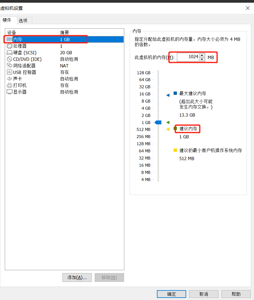 编辑虚拟机设置-内存(根据自己电脑情况设置,一般为建议内存,如果自己电脑内存比较大,可自行设置):