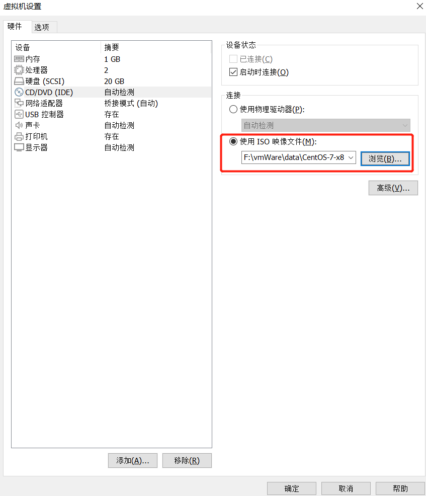 编辑虚拟机设置-CD/DVD(此处选择下载的镜像):