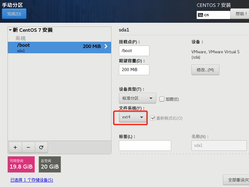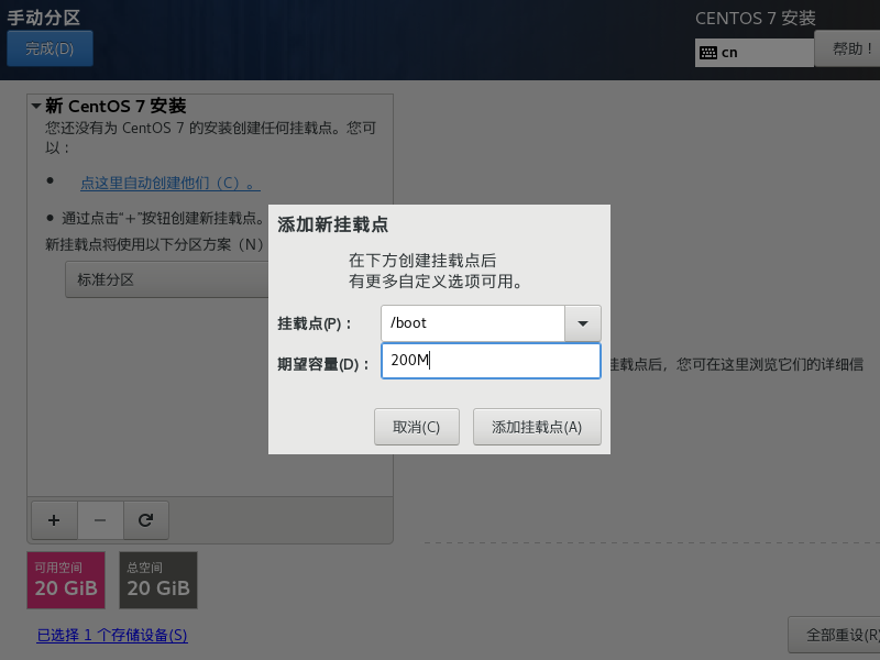 挂载点:/boot 期望容量:200M 文件系统:ext4