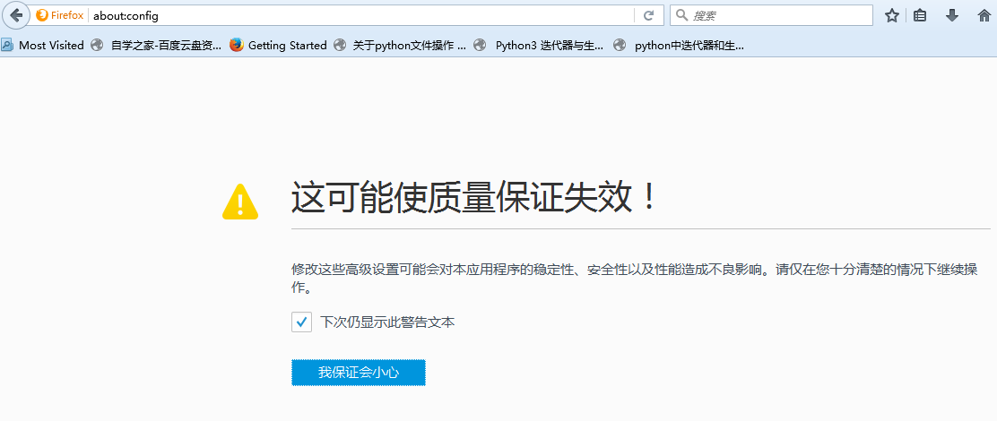 1. 在firefox浏览器输入about:config,提示:这可能会失去质保,点击“我保证会小心”