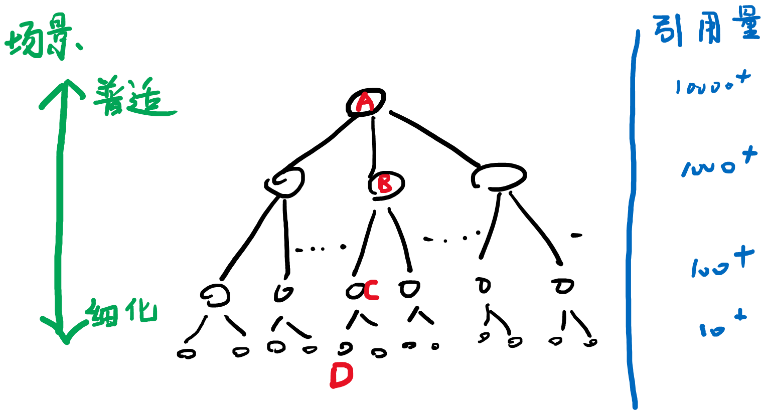 从我们掌握这个科研领域的insight的角度来说,阅读一百篇创新型很小的论文,意义不是很大。因此,我建议按照D->C->B->A这种深度优先去阅读。这样一来,你不需要把整棵树都看完,你只需要深入思考D->C->B->A这四篇文章即可!!!!!!