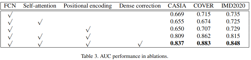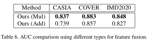 如下表6所示,特征融合有两种类型:乘法和加法。在我们的实验中,我们同时尝试了加法和乘法,实验结果表明,该乘法类型更适合于篡改定位任务,这与预期一致。