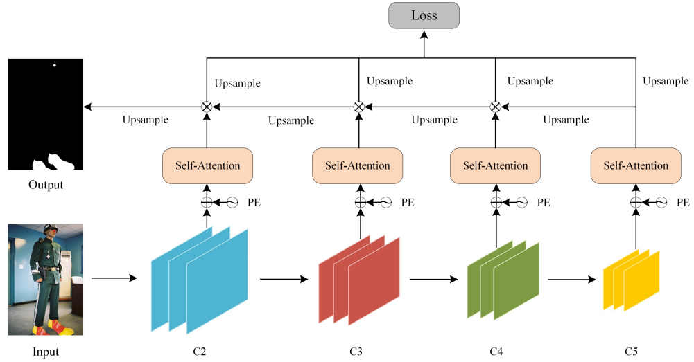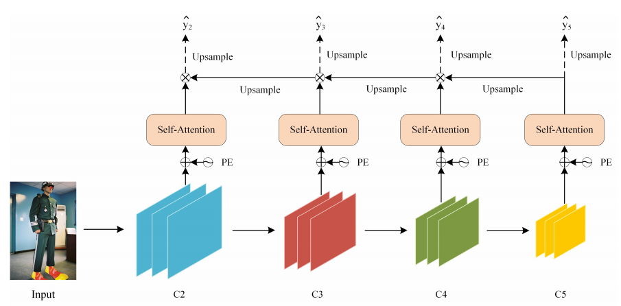- 然后,将四个块(C2、C3、C4和C5)的特征结合位置编码分别输入到自注意编码器中,捕获输入图像中“补丁”之间丰富的丰富交互。