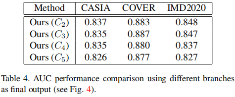 如上表4所示:低层次特征比深度特征对最终定位性能的贡献更大,这意味着我们的模型可以学习到通常隐藏在图像微小细节中的不可见痕迹。我们可以看到C3分支(即\(\hat{\mathbf{y}}_{3}\) )在性能和相对耗时方面都优于其他分支。