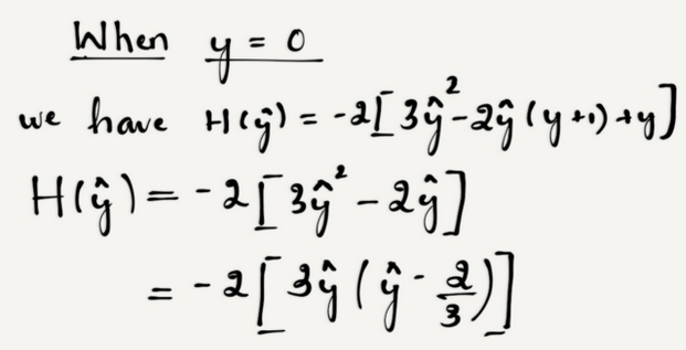 So in the above case when y = 0, it is clear from the equation that when ŷ lies in the range [0, 2/3] the function H(ŷ) ≥ 0 and when ŷ lies between