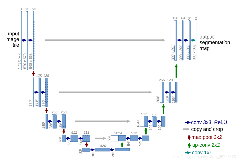 - 重复这个过程,直到获得输出388x388x2的feature map,