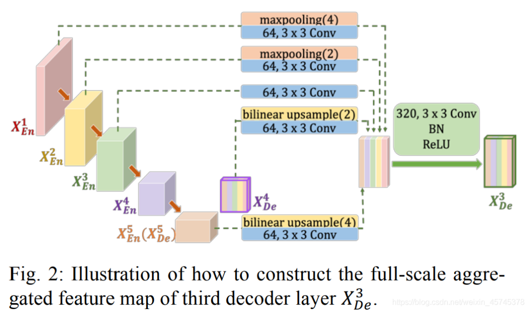 - 与U-Net 相比,一组编码器-解码间跳跃连接通过非重叠最大池化操作将来自较小尺度编码器层 \(X_{E n}^{1}\)和 \(X_{E n}^{2}\)进行池化下采样,以便传递底层的低级语义信息。