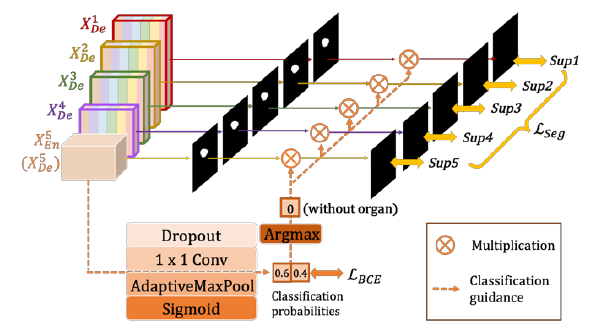 为了解决这个问题,增加了一个额外的分类任务,用于预测输入图像是否有器官。如在上面的图所示,经过一系列的操作包括dropout,卷积,maxpooling,sigmoid, 最后有两个值代表有/没有器官的概率,最深层次的二维张量 \(X_{E n}^{5}\),其中每一个代表的有/无器官的概率。