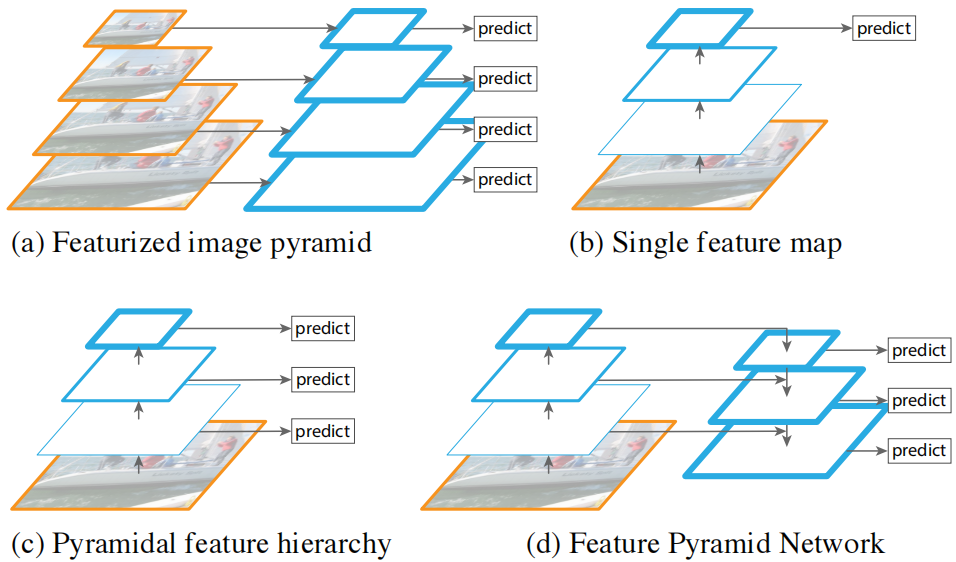 - 第二个挑战:多尺度物体的存在。几种方法已经被提出来处理这个问题,在本文中我们主要考虑了这些工作中的四种类型,如图1所示。