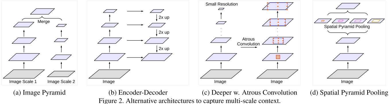 - 串联不同膨胀率的空洞卷积或者并行不同膨胀率的空洞卷积(v2的ASPP),来获取更多上下文信息