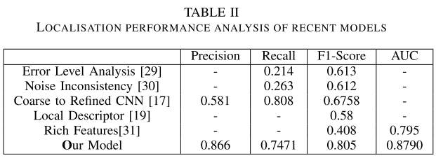 based U-Net Architecture for localization. In the classification part, we extract the image patches from the forged regions and non-forged regions in an image and classify them. The classification fetched us state of the art result. In the localization part, we have built a U-Net architecture by replacing the U-Net Encoder part with EfficientNet layers and keeping the decoder part as usual. We then pass the forged images through the network to train the model. The localization experiment also fetched state-of-the-art results.我们提出了一种基于迁移学习 (EfficientNet) 的图像分类算法,用于对伪造图像进行分类,并提出了一种基于 EfficientNet 的 U-Net 架构进行定位。在分类部分,我们从图像中的伪造区域和非伪造区域中提取图像块并对其进行分类。分类为我们提供了最先进的结果。在定位部分,我们通过将 U-Net 编码器部分替换为 EfficientNet 层并保持解码器部分与往常一样,构建了一个 U-Net 架构。然后我们通过网络传递伪造的图像来训练模型。本地化实验也取得了最先进的结果。