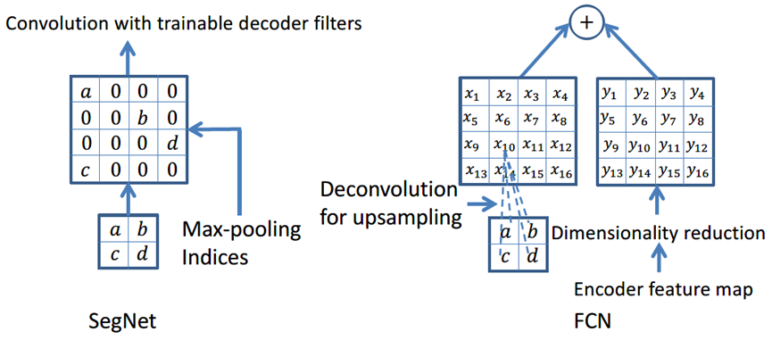 SegNet研究团队认为编码器下采样过程中图像信息损失较多,直接存储所有卷积块的特征图又非常占用内存,因而在SegNet中提出在每一次最大池化下采样前存储最大池化的位置索引(Max-pooling indices),即记住最大池化操作中,最大值在22池化窗口中的位置。每个22窗口仅需要2 bits内存存储量,这种池化位置索引可用于上采样解码时恢复图像信息。下图给出了SegNet与FCN之间的上采样方法对比。可以观察到,SegNet使用双线性插值并结合最大池化位置索引进行上采样,而FCN则是基于去卷积结合编码器卷积特征图进行上采样。