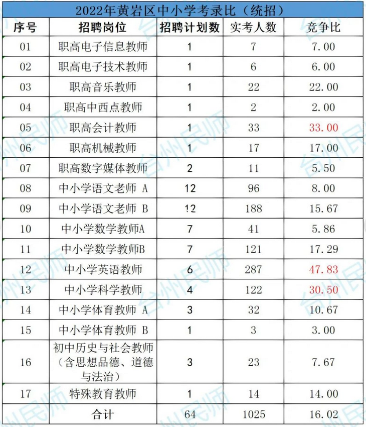 【教师招聘】台州市黄岩区教育局下属中小学校优秀教师招聘公告