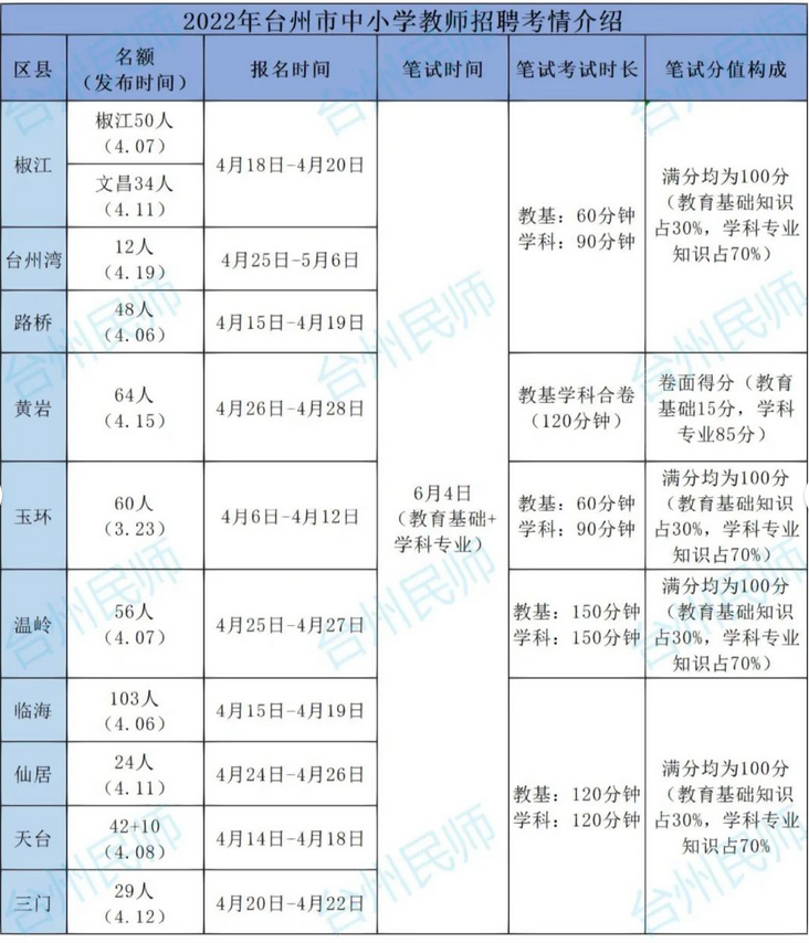 椒江、路桥、温岭、玉环、临海、三门、仙居、天台地区,教基占比30%,学科占比70%。以分卷为主,教基一张卷100分,学科一张卷100分。考试时间2h-2.5h不等,具体视公告为准。其中临海、三门、仙居、天台地区为同一张考卷。