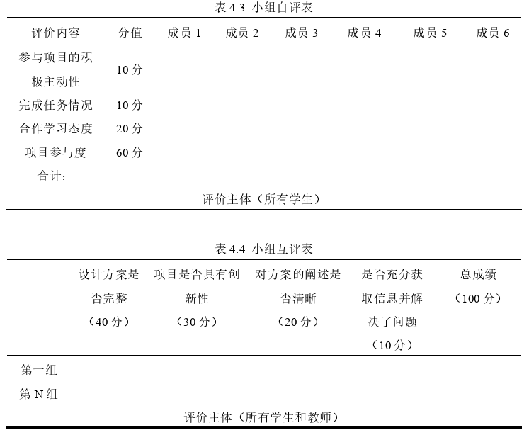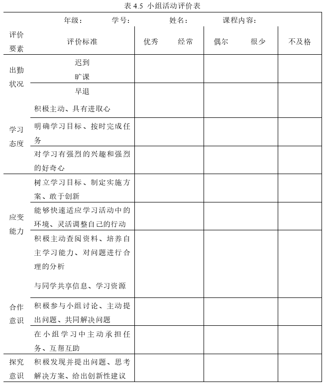 多元化的评价方式是行动导向教学法的构成要素之一[76]。传统的教学评价以教师评价为主体,而多元化的评价方式应该是以学生为主,教师为辅的评价组合方式。在评价过程中,要注重教师评价和学生评价相结合,教师和学生都是教学活动中不可或缺的部分,教师作为引导者,应该善于观察学生的表现,在教学结束后作出公平客观地评价。教学评价的方式可以总结为自评、互评和师评。自评指的是,在模块任务结束后,每个小组成员对其他组员的贡献、参与度和工作质量等方面进行评价,小组自评表如表4.3所示。自评有助于找到小组的强项和需要改进之处,鼓励小组成员更加负责地完成任务。互评指的是不同小组之间互相的评价,确定特定标准下任务完成最优秀的小组,小组互评表如表4.4所示。互评能够促进小组之间良性竞争,使学生积极地参与到课堂中来。教师评价在教学过程中也是至关重要的,在一定程度上,教师能够及时调整评价方向,学生通过教师评价能够将所学知识整合内化,反思自己的学习需求。