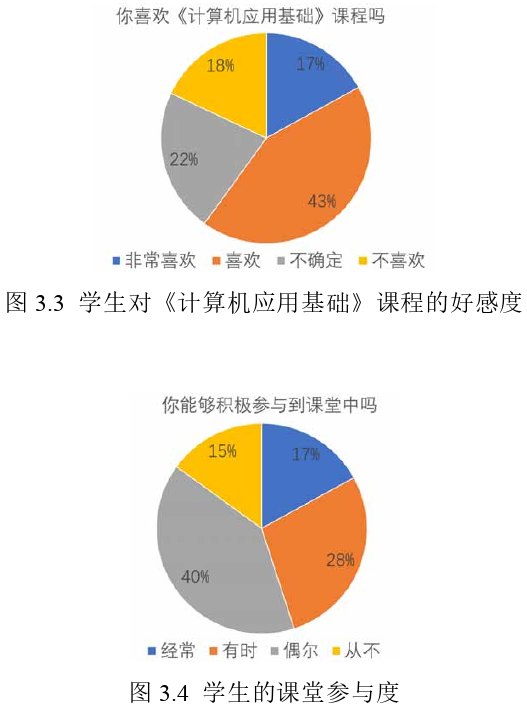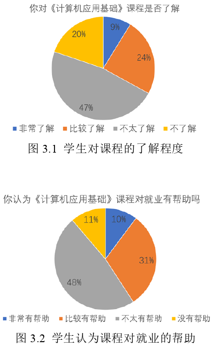 通过调查学生对《计算机应用基础》课程的了解情况可以看出学生对于课程的认知处于初级阶段,大部分学生不了解这门课程。学生对于课程的认知不清晰,认为《计算机应用基础》课程对未来的就业帮助不大,难以获得自己在未来的工作中需要掌握的技能。通过与教师的对话访谈可以发现学生对课程认知不清晰是因为目前中职《计算机应用基础》课程的教学目标不明确,没有与工作岗位需求接轨。教学目标是课程和教学的基础,是完成教学任务之后,对实际应用知识与技能的期望。虽然《计算机应用基础》课程目标也对学生的专业知识和技能提出一定要求,但目前多数教师在确立教学目标时,仅注重学生知识层面的掌握情况,忽略学生良好的学习习惯、岗位技能等职业素养的培养。除此之外,一些教师忽略了不同班级和学生之间的差异,要求所有学生达到统一的目标。有些学生对于这些无法达到的目标产生厌恶情绪,从而影响了教学效果。