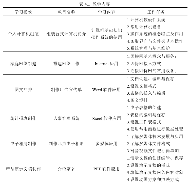 基于行动导向教学法的《计算机应用基础》课程教学内容设计更加注重在实际中的应用,这与传统教学强调课程的知识体系不同。教学内容不再以教材为中心,而是“以行动为导向”灵活地选择和编排教学内容。通过对行业企业对计算机相关岗位人才的需求和样本学校提供的《计算机应用基础》课程教学大纲与教材以及课程内容分析的基础上,选取与岗位要求相匹配的教学内容整合成学习模块。每一个学习模块对应一个具体的项目,项目中包含具体的工作任务,并且与典型工作任务相对应,具体教学内容如表4.1所示。此外,为了更好地满足社会对计算机人才的需求,教师不仅需要适当增加补充知识,还应该充分利用信息化手段。学生能够了解更多关于计算机的新知识,与社会需求保持一致,在实际工作和生活中学以致用,提高学生的就业能力和职业素养。