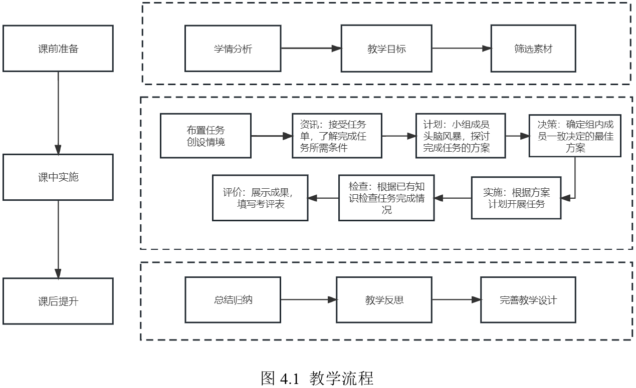 在课后总结阶段,教师将项目成绩、小组活动成绩和笔试成绩按比例计算,综合得出学生期末成绩。通过学生的期末成绩进行分析,了解学生学习情况。对教学过程中出现的问题、不合理之处展开反思与总结。改进教学设计,及时调整教学方案,从而提高教学质量。具体的教学流程图如图4.1所示。